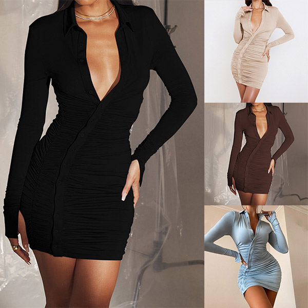 Only need one glance,you would be attracted by this sexy and chic dress. Solid color style,finished with long sleeve,POLO collar and a fit silhouette,this dress is a good chance to showcase your perfect figure. Moreover,the oblique-button and wrinkled details will make this piece look more attractive and distinctive. You can easily express your beauty and charm through this dress.