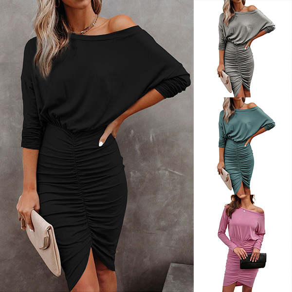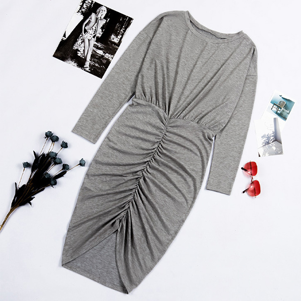 Sexy Long Sleeve Round Neck Irregular Hem Solid Color Wrinkled Dress