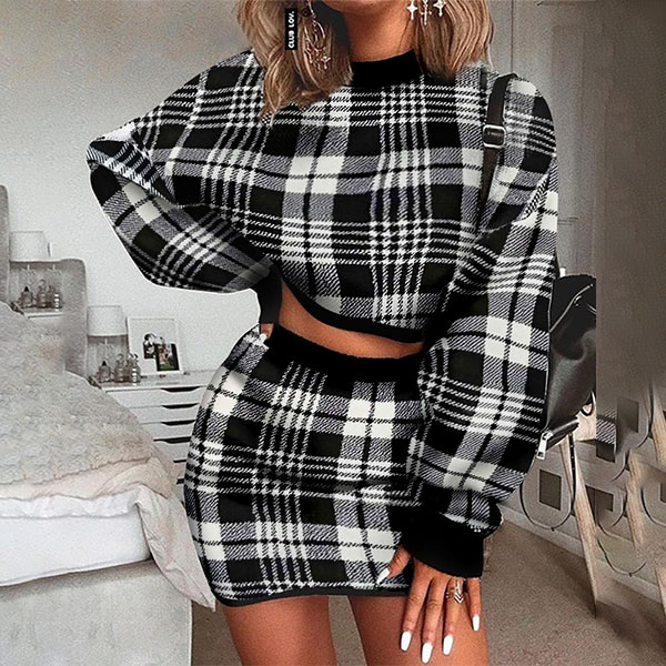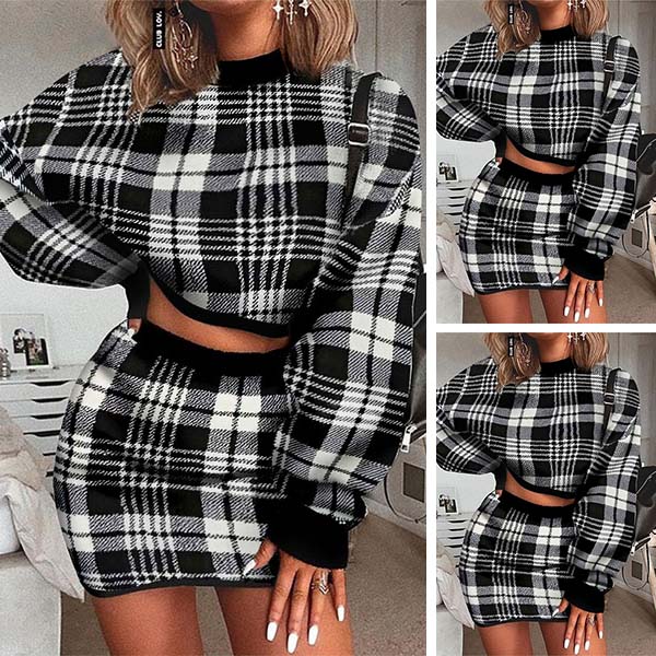 Sexy Long Sleeve Round Neck Plaid Crop Top + Skirt Two-piece Set