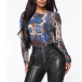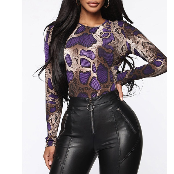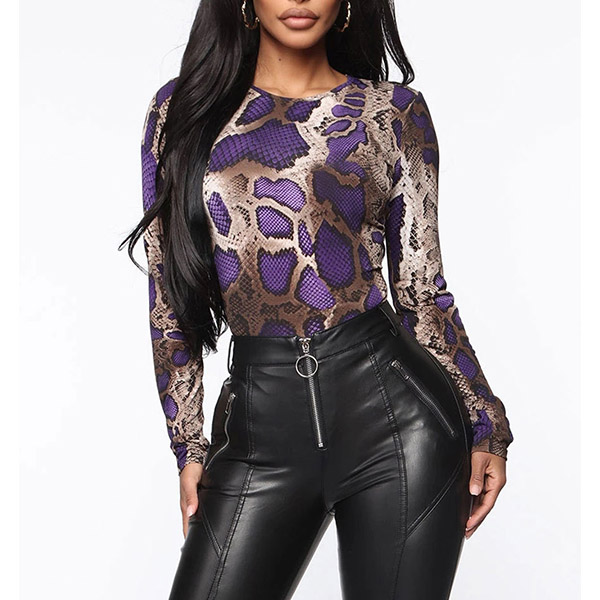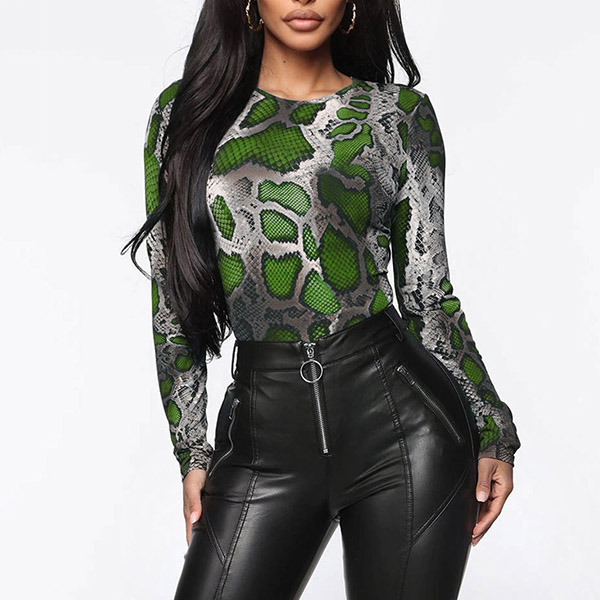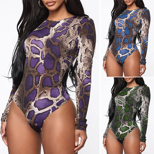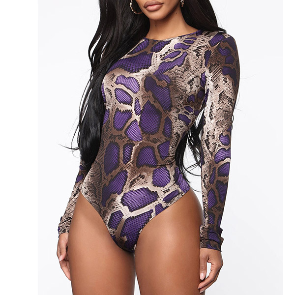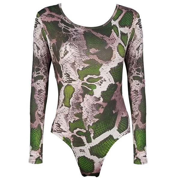 Sexy Long Sleeve Round Neck Serpentine Printed Bodysuit