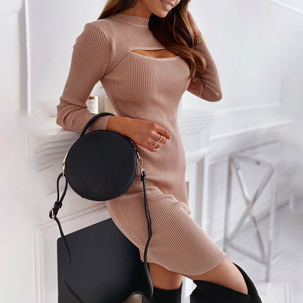 Sexy Long Sleeve Round Neck Slit Hem Hollow Out Dress