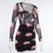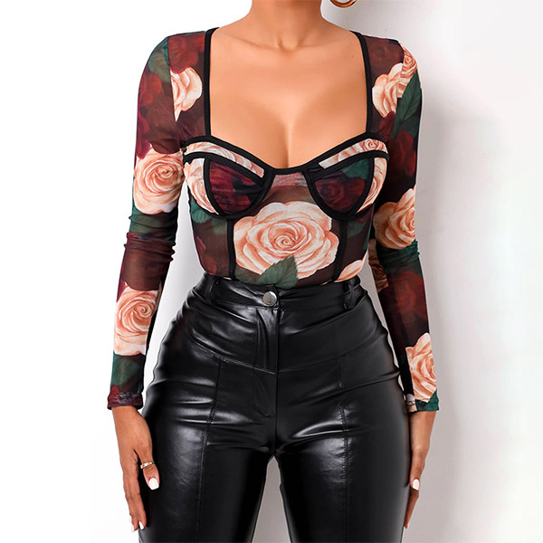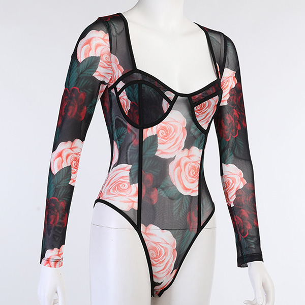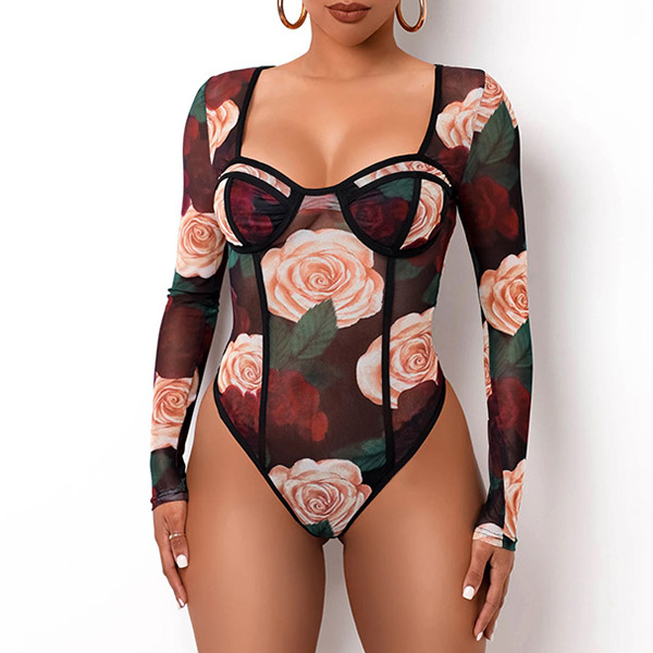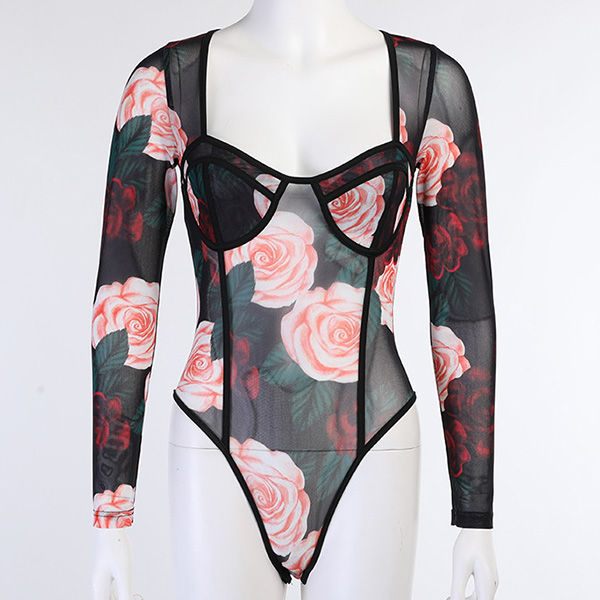 Sexy Long Sleeve Square Collar See-through Printed Dress/Bodysuit