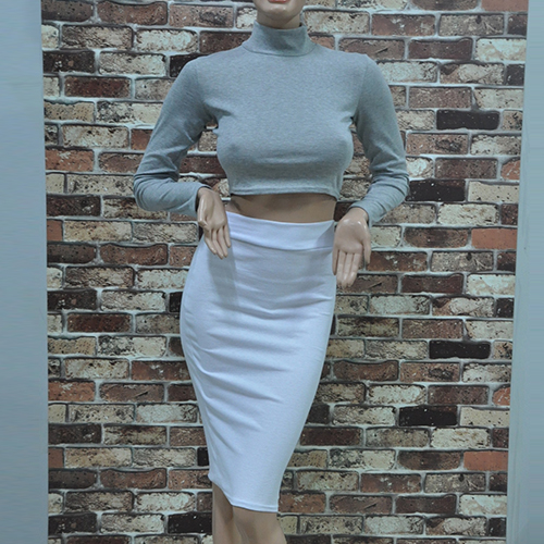Two-piece style. Tops with solid color,long sleeve,turtleneck and dew navel design. Skirt with knitted style,
