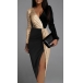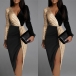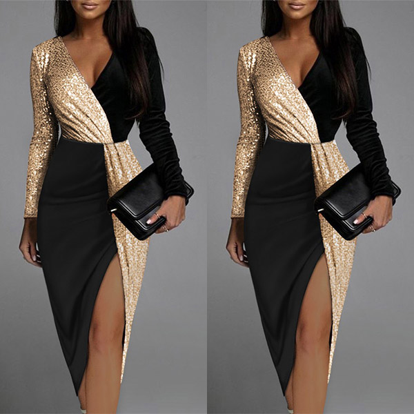 Sexy Long Sleeve V-neck Contrast Color Sequined Spliced High Slit Party Dress