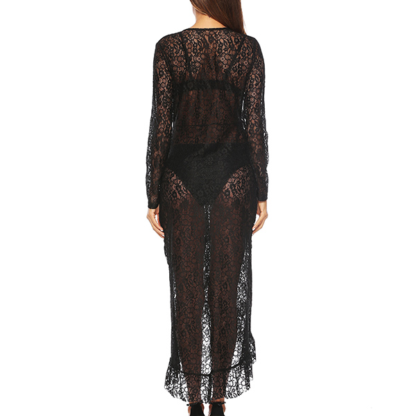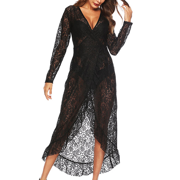 Sexy Long Sleeve V-neck High-low Hemline Semi-through Lace Dress