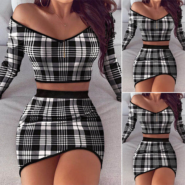 Sexy Long Sleeve V-neck Plaid Crop Top + Skirt Two-piece Set