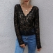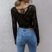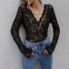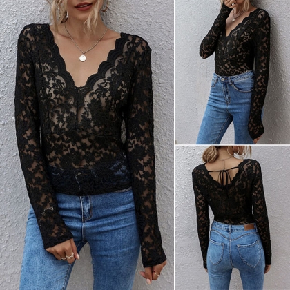 Sexy Long Sleeve V-neck See-through Lace T-shirt