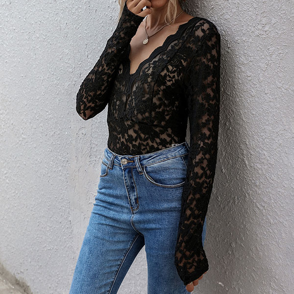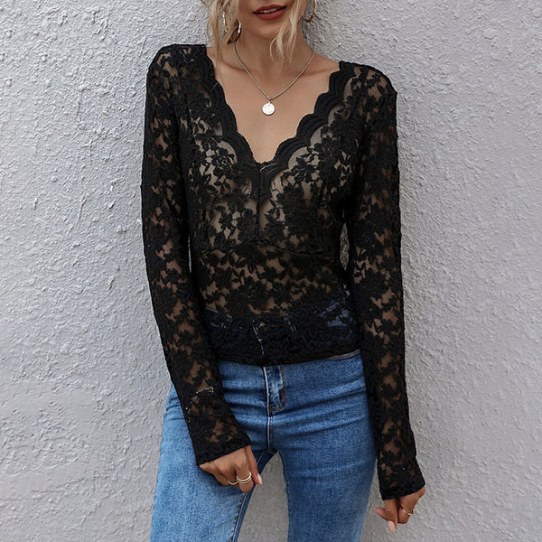 Inject a dash of sexy and flirty vibes to your wardrobe with this lace t-shirt. See-through style,with long sleeve,v-neck and a fit silhouette,this piece not only can showcase your perfect body-line,but also can exude your charming feminine appeal. Try to match with your favourite pants to start your wonderful day.