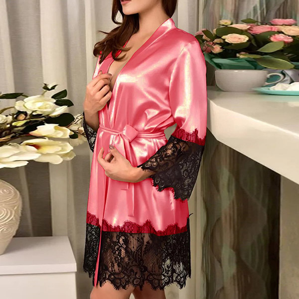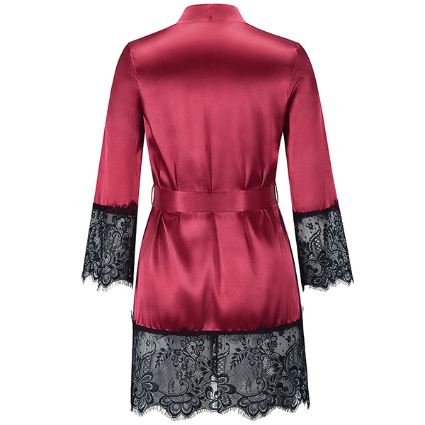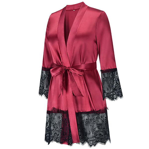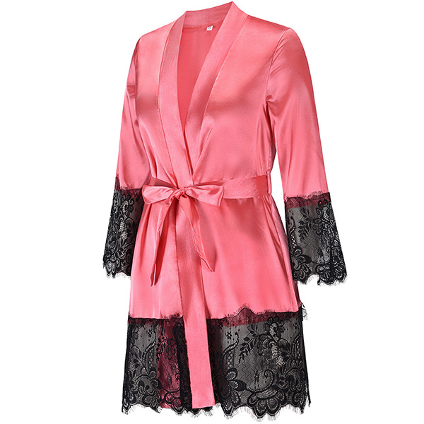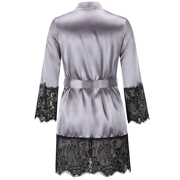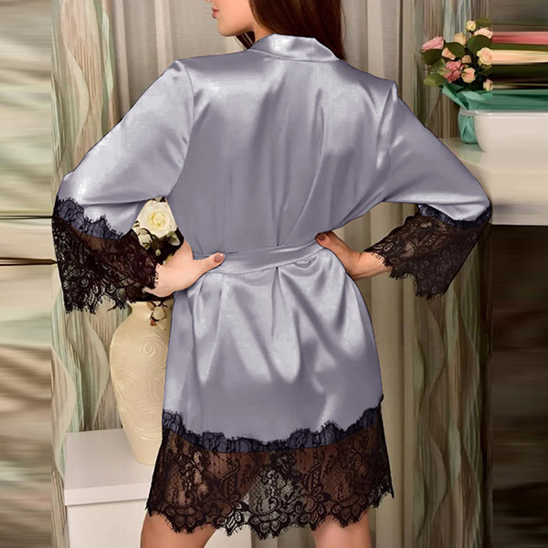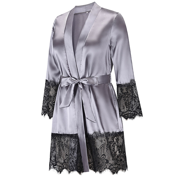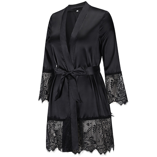 Sexy Long Sleeve V-neck Super-thin Lace Spliced Silk Robe