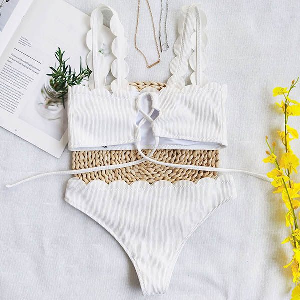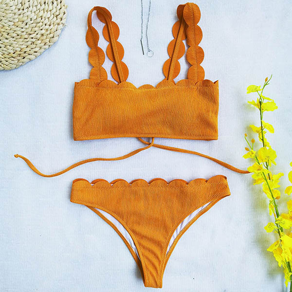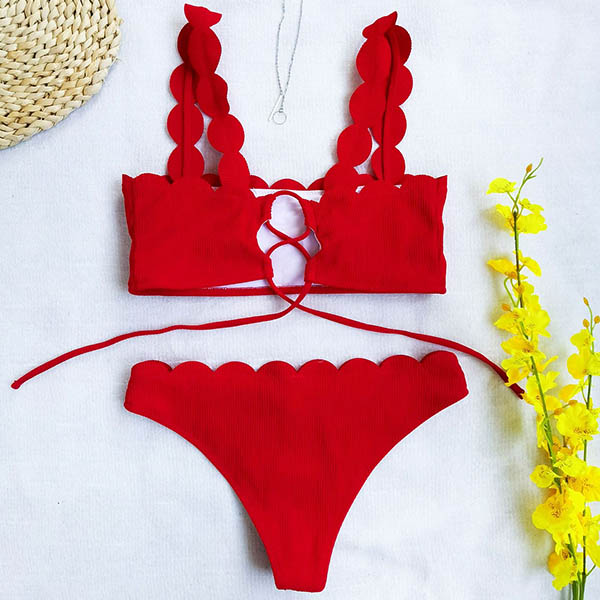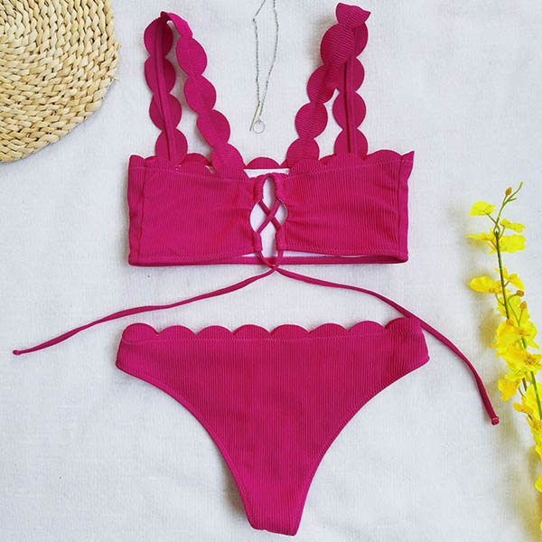 As for your beach days,a cozy yet sexy bikini set is an essential. So how about this set? Solid color style,the wavy edge design makes it look so attractive. Including a backless bikini top and a low-waist bikini bottom,this bikini set can give you a happy and memorable beach time.