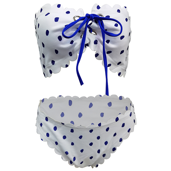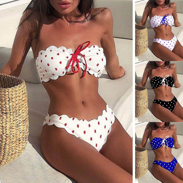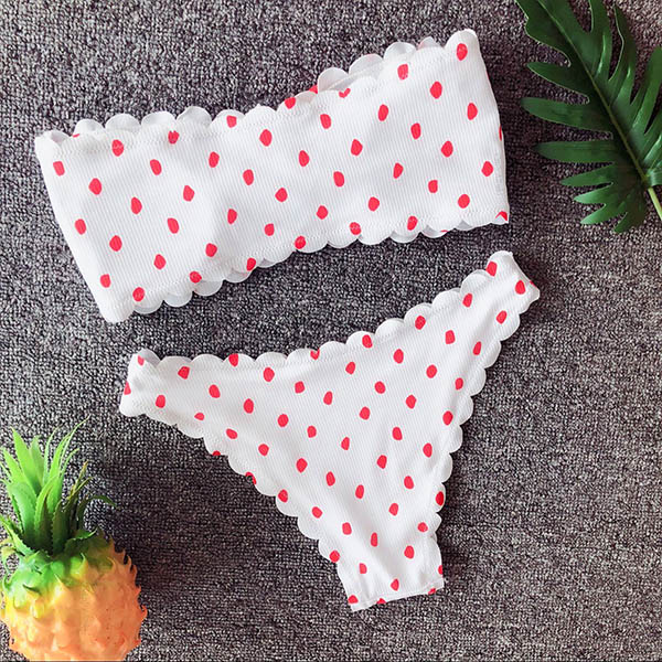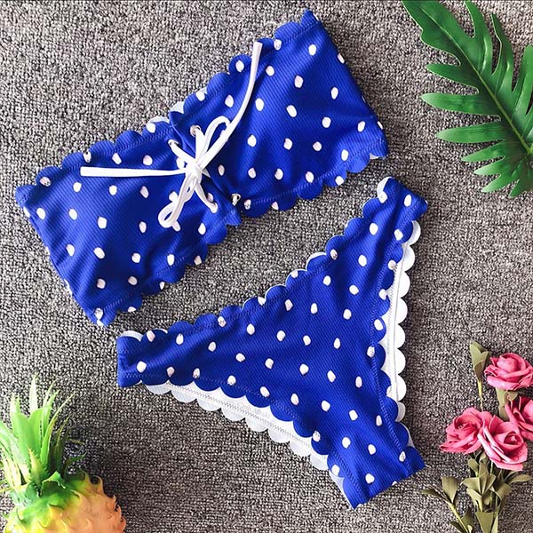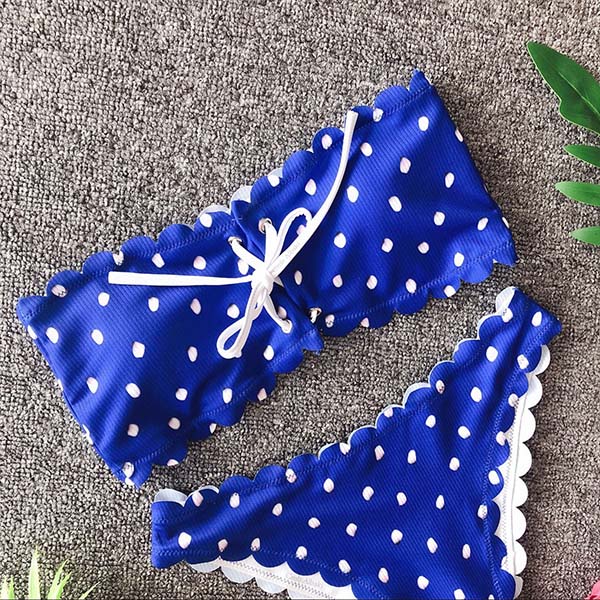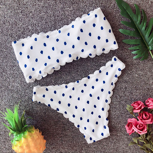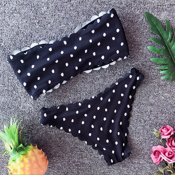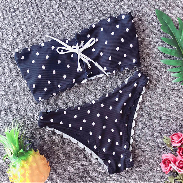 When the summer season hits,this cozy yet sexy bikini set can easily arouse your attention. Including a bandeau bikini top and a low-waist bikini bottom,designed with dots printed details,this bikini set is a good chance to showcase your charming skin and seductive curve.