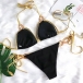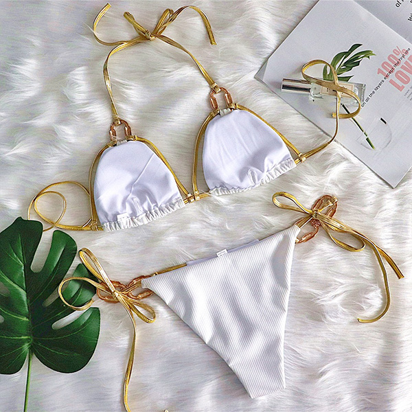 When you head to the seaside with this bikini set,you can easily be the focus to draw more attention. Contrast color element,hollow out and low-waist design make this bikini set look so sexy and alluring. If you wanna achieve for a more alluring beach look,you can just add a body chain!