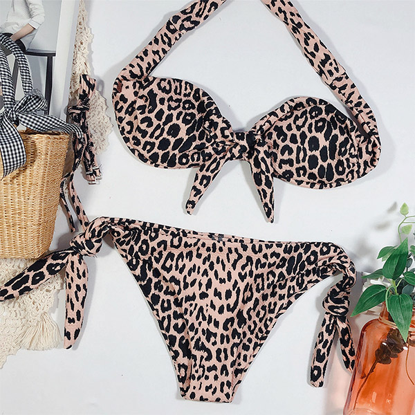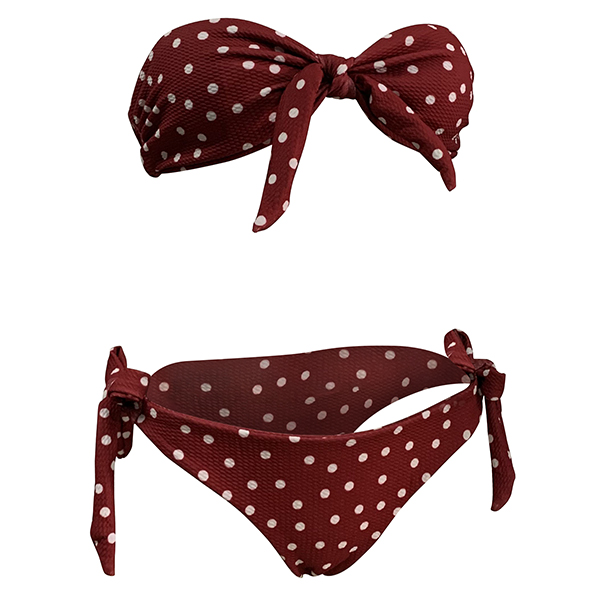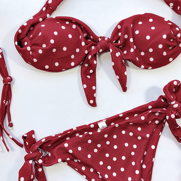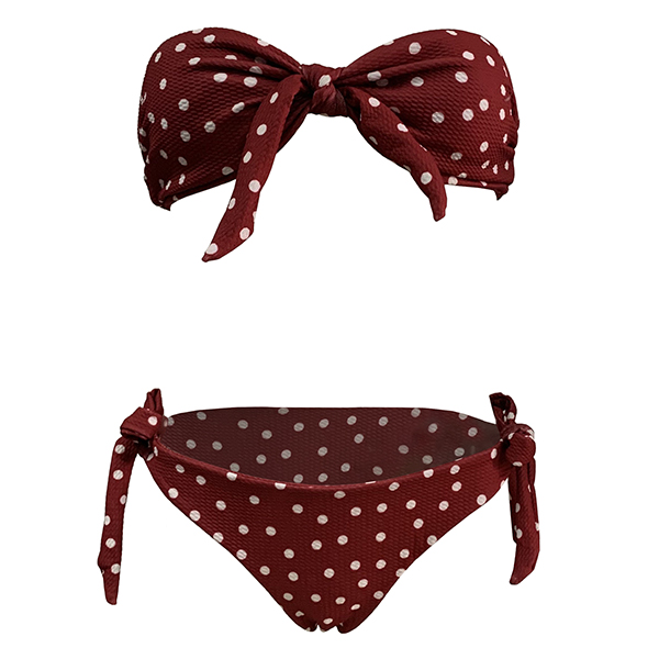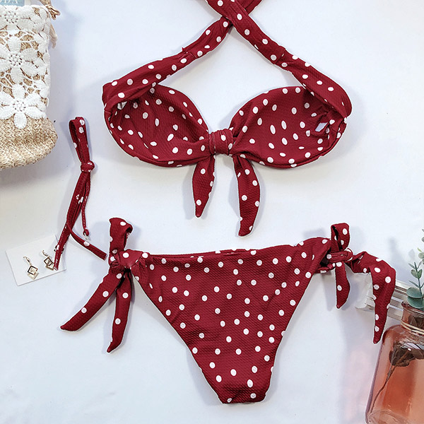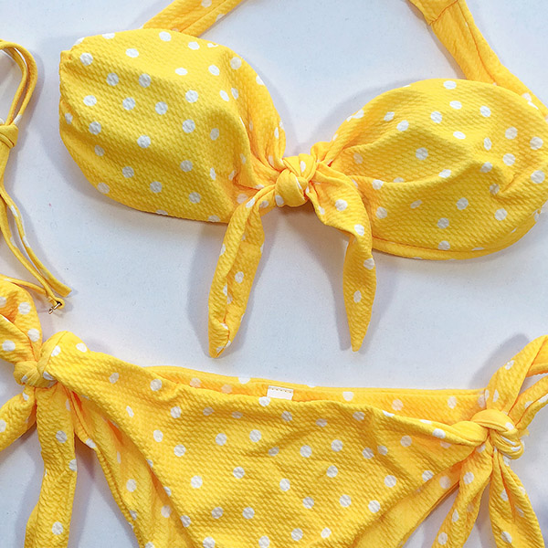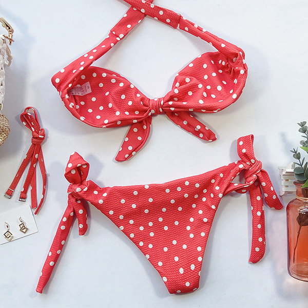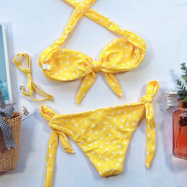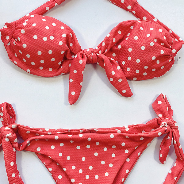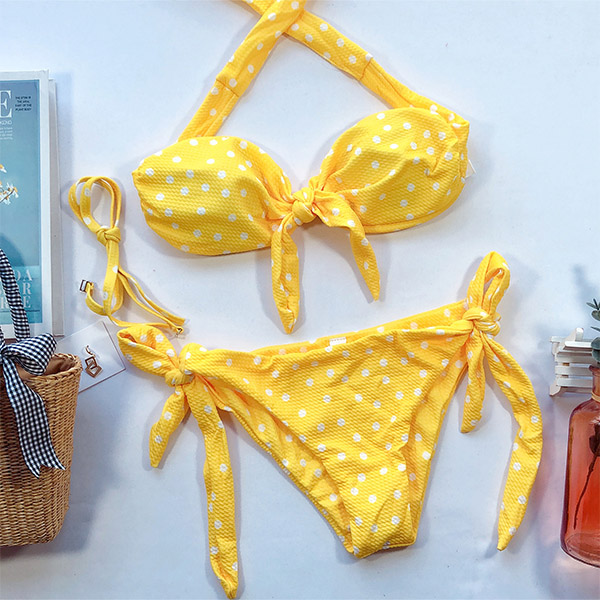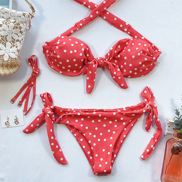 When the summer season hits,it is a good time for you to head to the seaside to relax yourself. So we suggest you choosing this sexy bikini set. The dots printed details make it look so eye-catching and playful. Including a low-waist bikini bottom and a bandeau bikini top,this bikini set can flaunt off your sexy and seductive curve. And the knotted design will further enhance its charm.