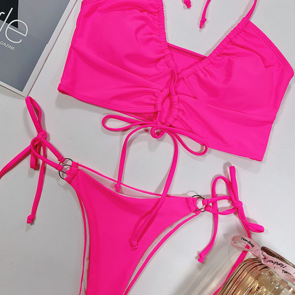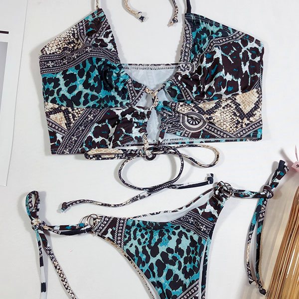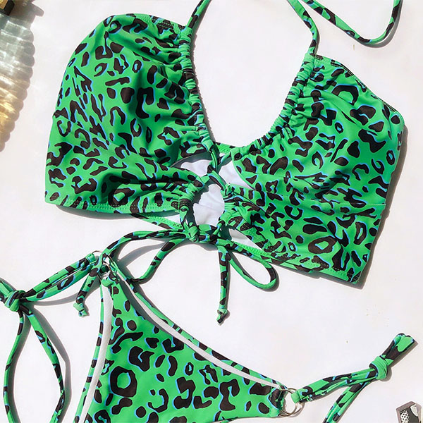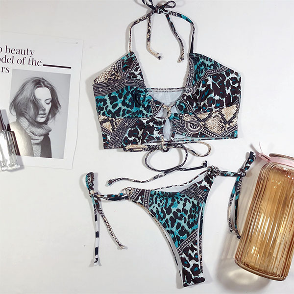 When you walk on the beach with this bikini set,you can easily be a pleasant sight to draw more attention. The leopard printed details make it look more eye-catching,while the lace-up details will make it look more alluring. You can match with a body chain to achieve for a more stunning beach look!