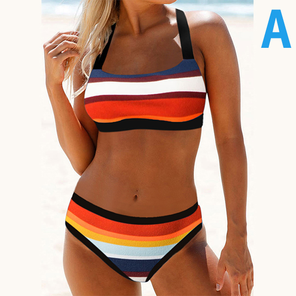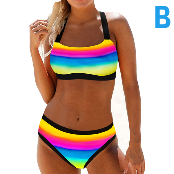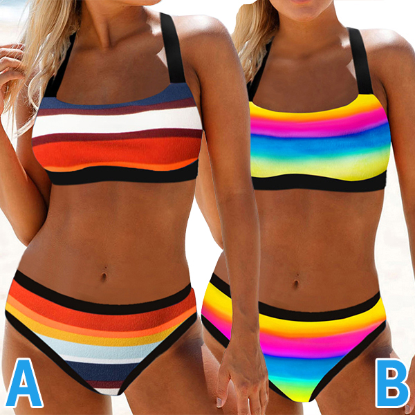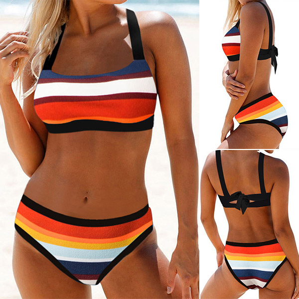 When walking on the beach with this bikini set,you can easily arouse more eyes. The rainbow stripe printed details make it look so eye-catching. Including a backless bikini top and a low-waist bikini bottom,this bikini set can give you a long-lasting comfort with its soft,breathable and quick-dry fabric.
