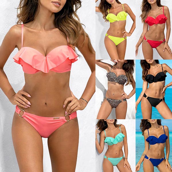 You can easily be a sexy and charming bikini girl when you are waking on the beach with this bikini set. Including a ruffle bikini top and a low-waist bikini bottom,this bikini set is a good way to flaunt off your seductive curve and charming skin. You can match with a sparkle body chain for a more stunning look.