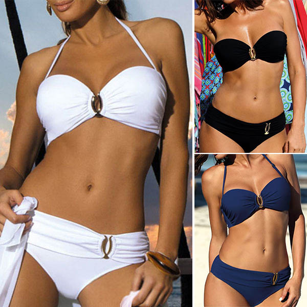 Hey,girls,you can just lie on the beach with this bikini set to enjoy the sunbathing! Solid color style,including a halter bikini top and a low-waist bikini bottom,this bikini set is a good way to flaunt off your charming skin and seductive curve. You can match with a chiffon cardigan for a more charming beach look.