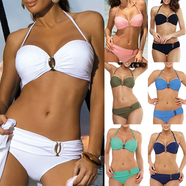 As for your beach days and tropical getaways,this bikini set is worth to arouse your attention. Solid color style,including a push-up bikini top and a low-waist bikini bottom,this bikini set knows how to flaunt off your perfect figure and curve. Moreover,the metal button design will make this piece look more attractive. Like it? Then buy one set!