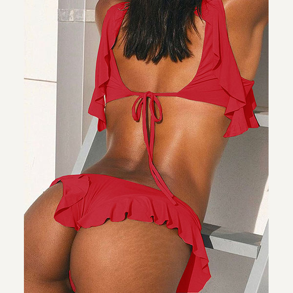 When you wanna head to the seaside,then this cozy yet sexy bikini set is worth to have a place in your suitcase. Solid color style,the low-waist,backless and ruffle design will make it look more alluring,while its soft and breathable fabric can give you a long-lasting comfort. For your beach days and tropical getaways,this bikini set can be your perfect choice.