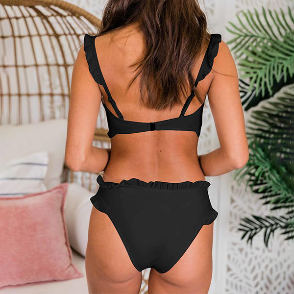 When it comes to the beach,the bikini set will first come into your mind. So how about this set? Solid color style,the low-waist and ruffle design can lend you a dash of sweet yet flirty vibes. I promise you can easily win more eyes when you are walking on the beach with this bikini set!