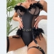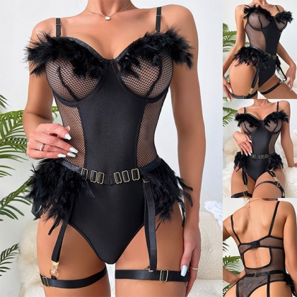 Sexy Mesh-net Lace Feather Spliced Backless Lingerie Bodysuit