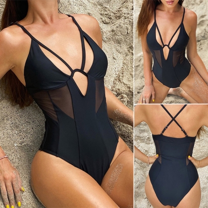 Sexy Mesh Spliced V-neck Cutout One-piece Swimsuit/Monokini