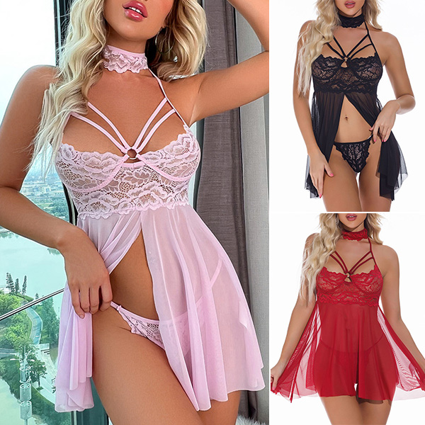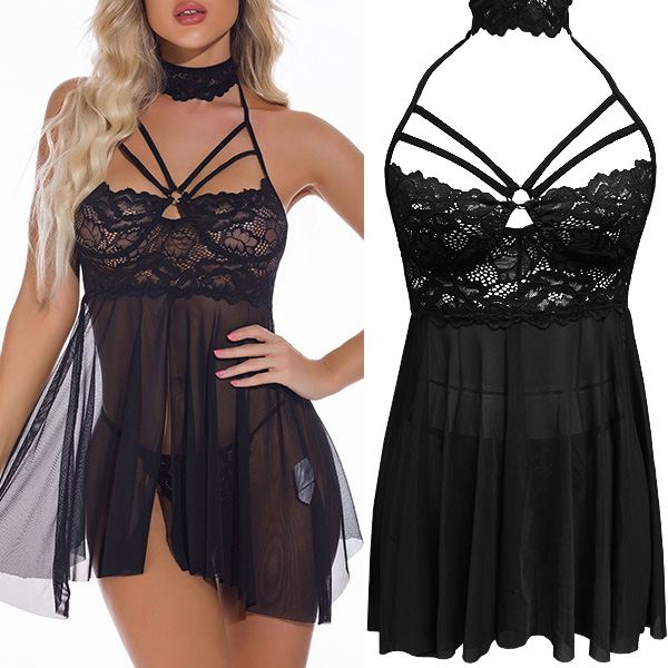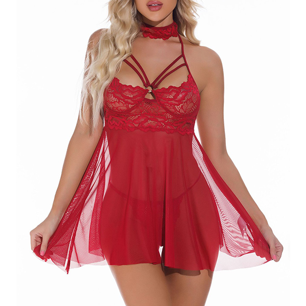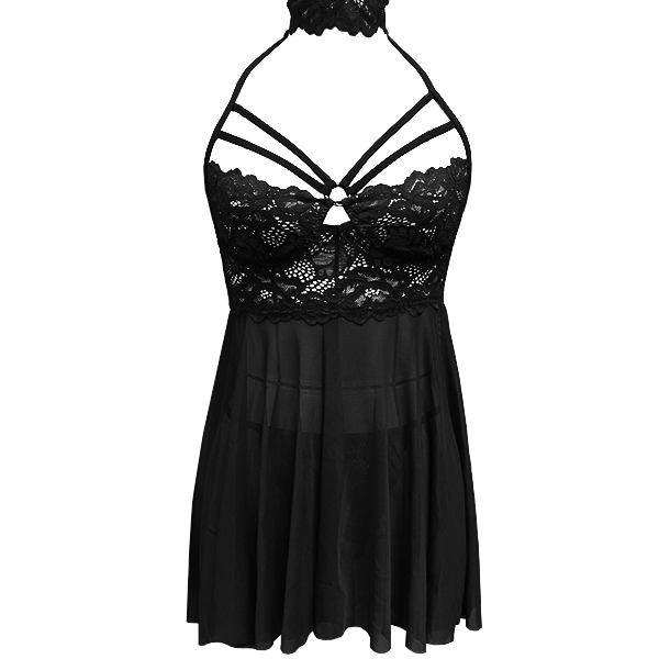Sexy Mock Neck Cutout Lace Spliced Gauze Nightwear Dress