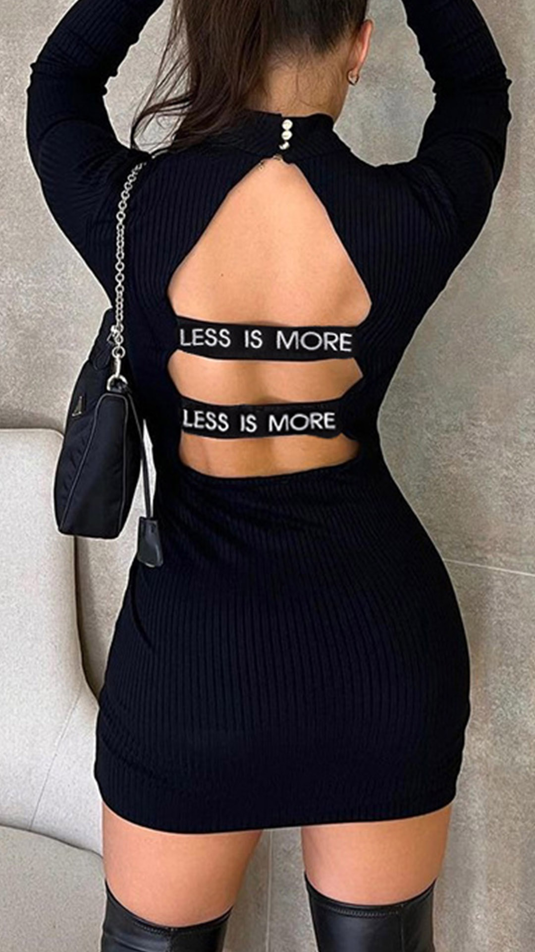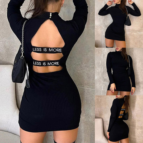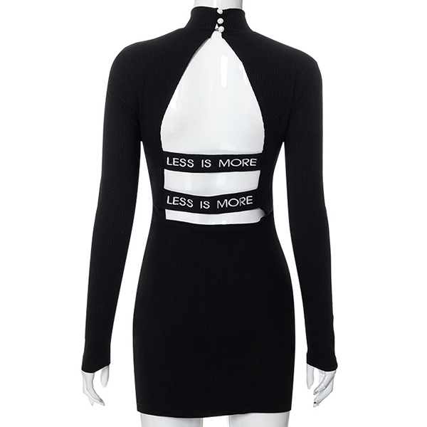 This Sexy Black Bodycon Dress is the perfect way to make a statement. The long sleeves and mock neck provide a sophisticated look, while the backless design with cutout details and letter printed adds a sultry touch. Crafted from a stretchy fabric, this dress is designed to hug your curves for a flattering silhouette.