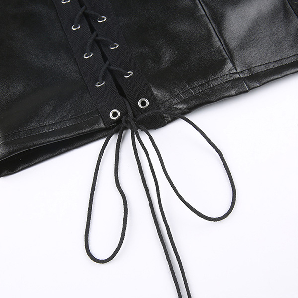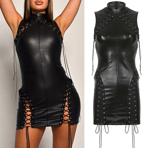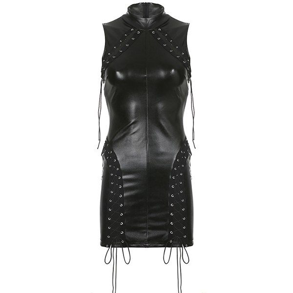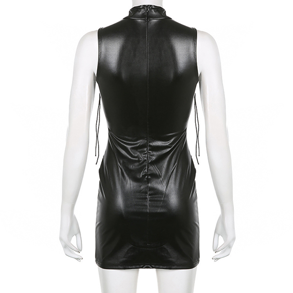 Sexy Mock Neck Sleeveless Lace-up Artificial Leather PU Bodycon Dress