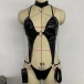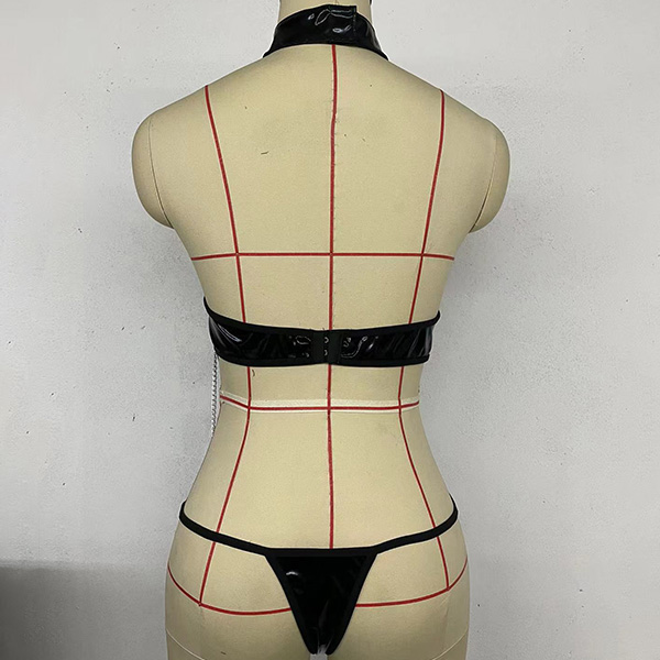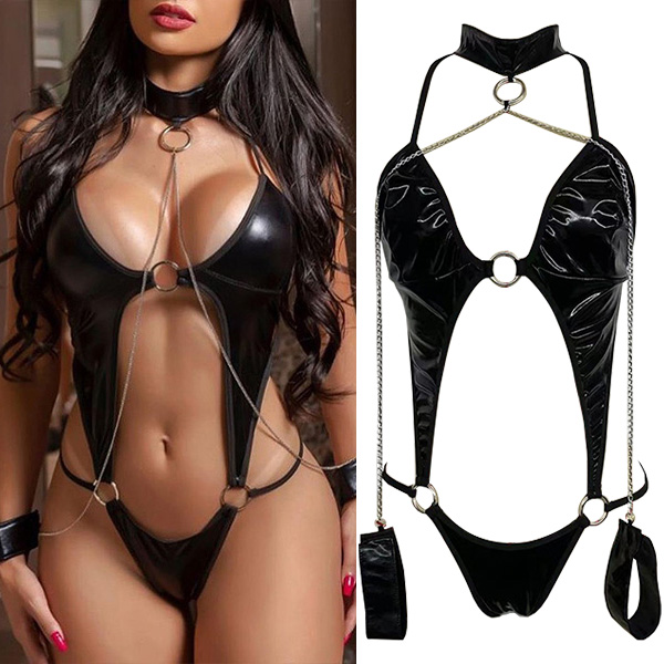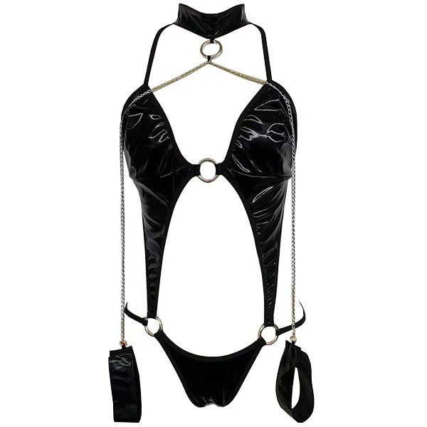 Sexy O-ring Artificial Leather PU Lingerie Bodysuit with Chain