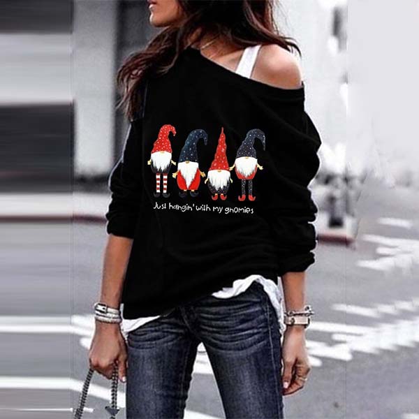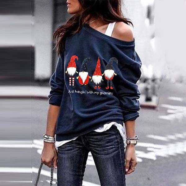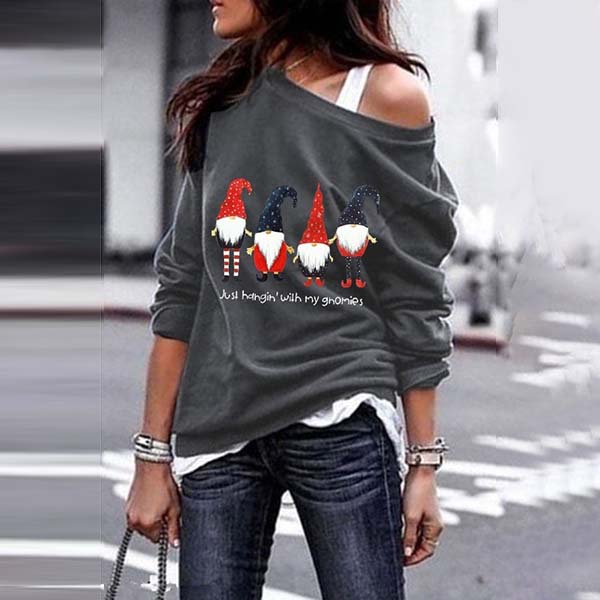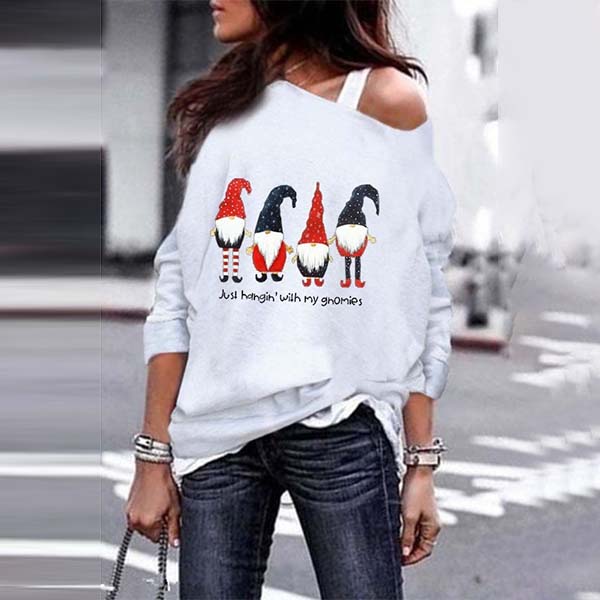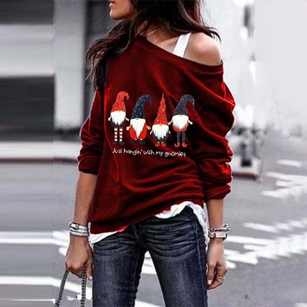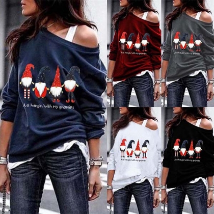 Sexy Oblique Shoulder Long Sleeve Santa Claus Printed Sweatshirt