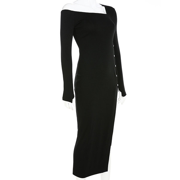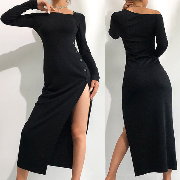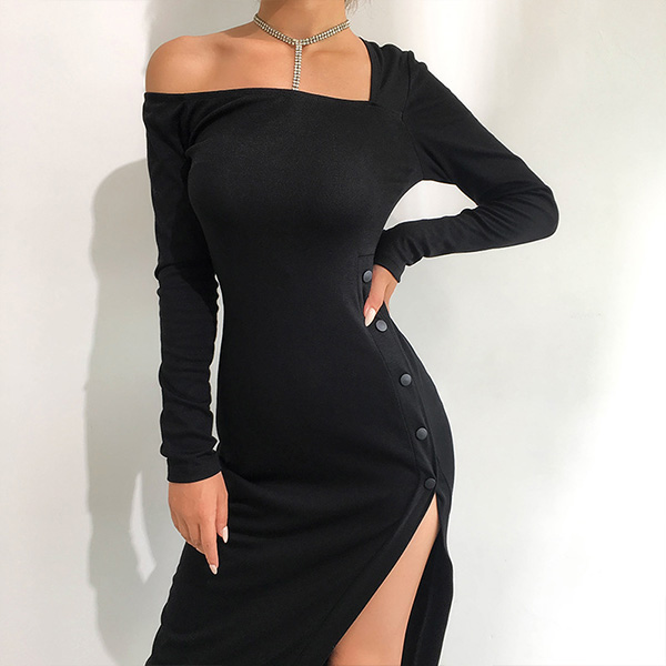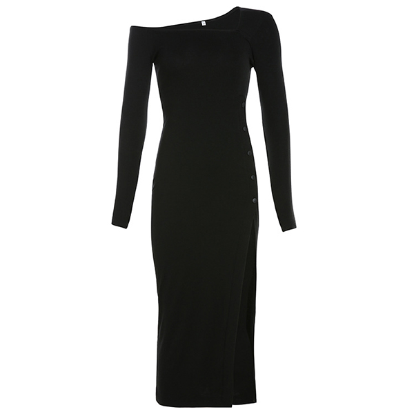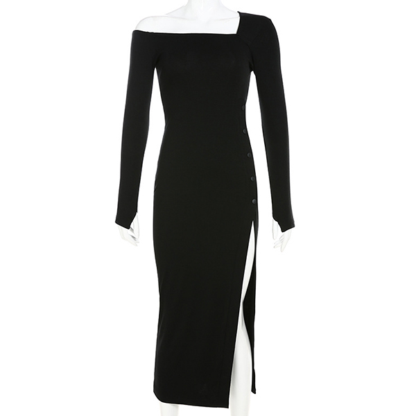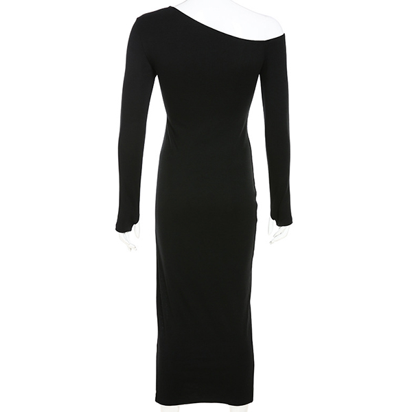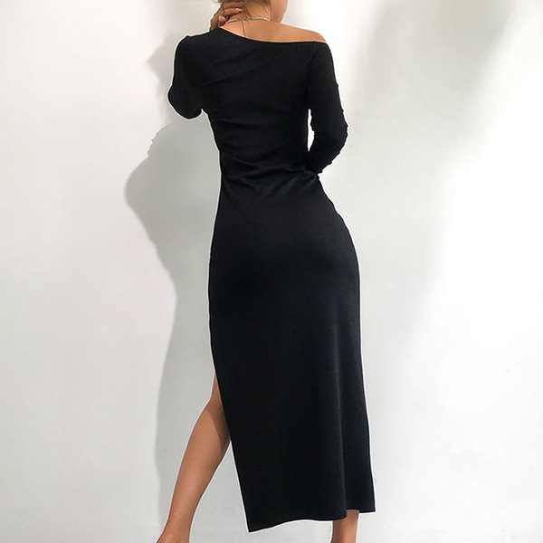 Sexy Oblique Shoulder Long Sleeve Slit Hem Solid Color Slim Fit Dress