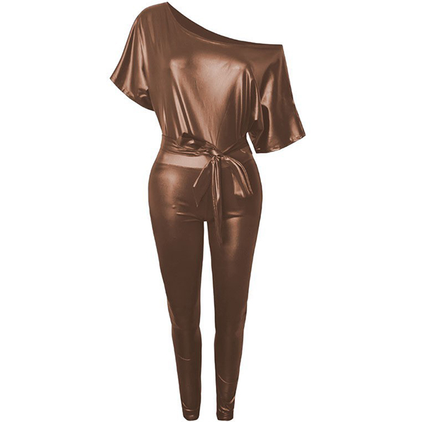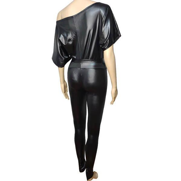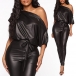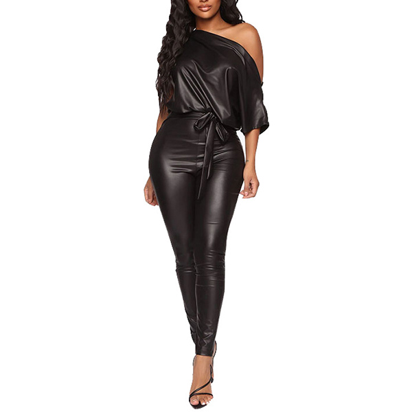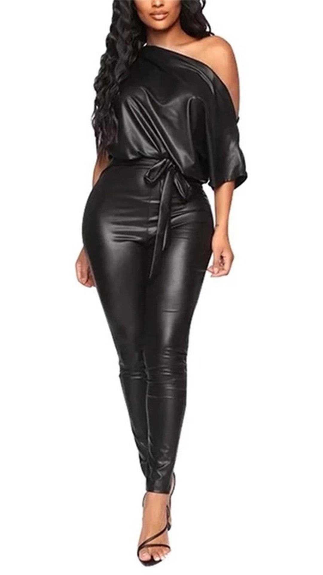 Sexy Oblique Shoulder Short Sleeve High Waist Slim Fit PU Leather Jumpsuit