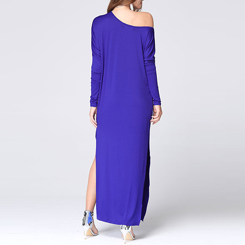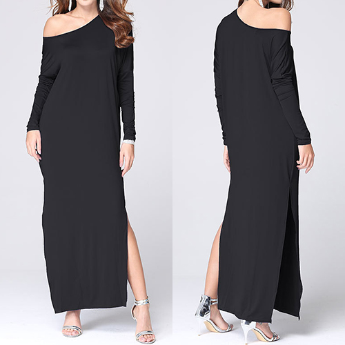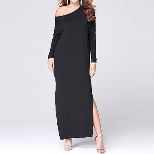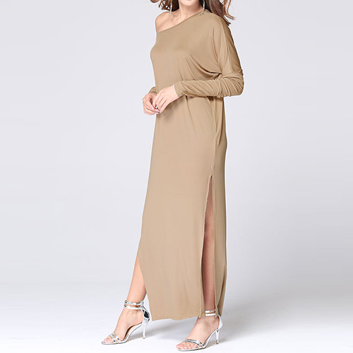 some attention. Boasting a solid color,its oblique shoulder and slit hem design makes this piece more