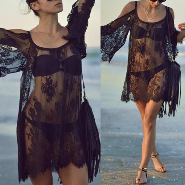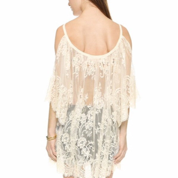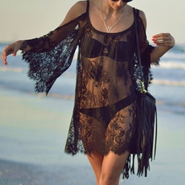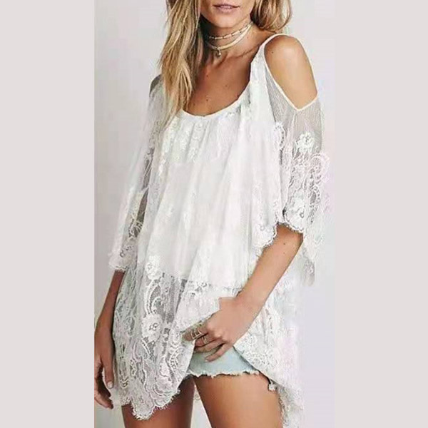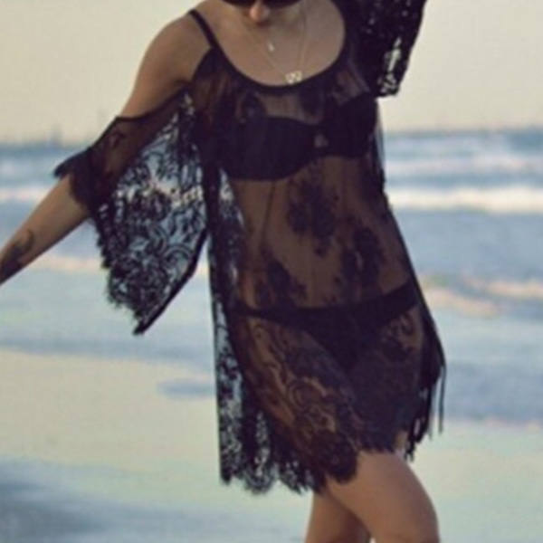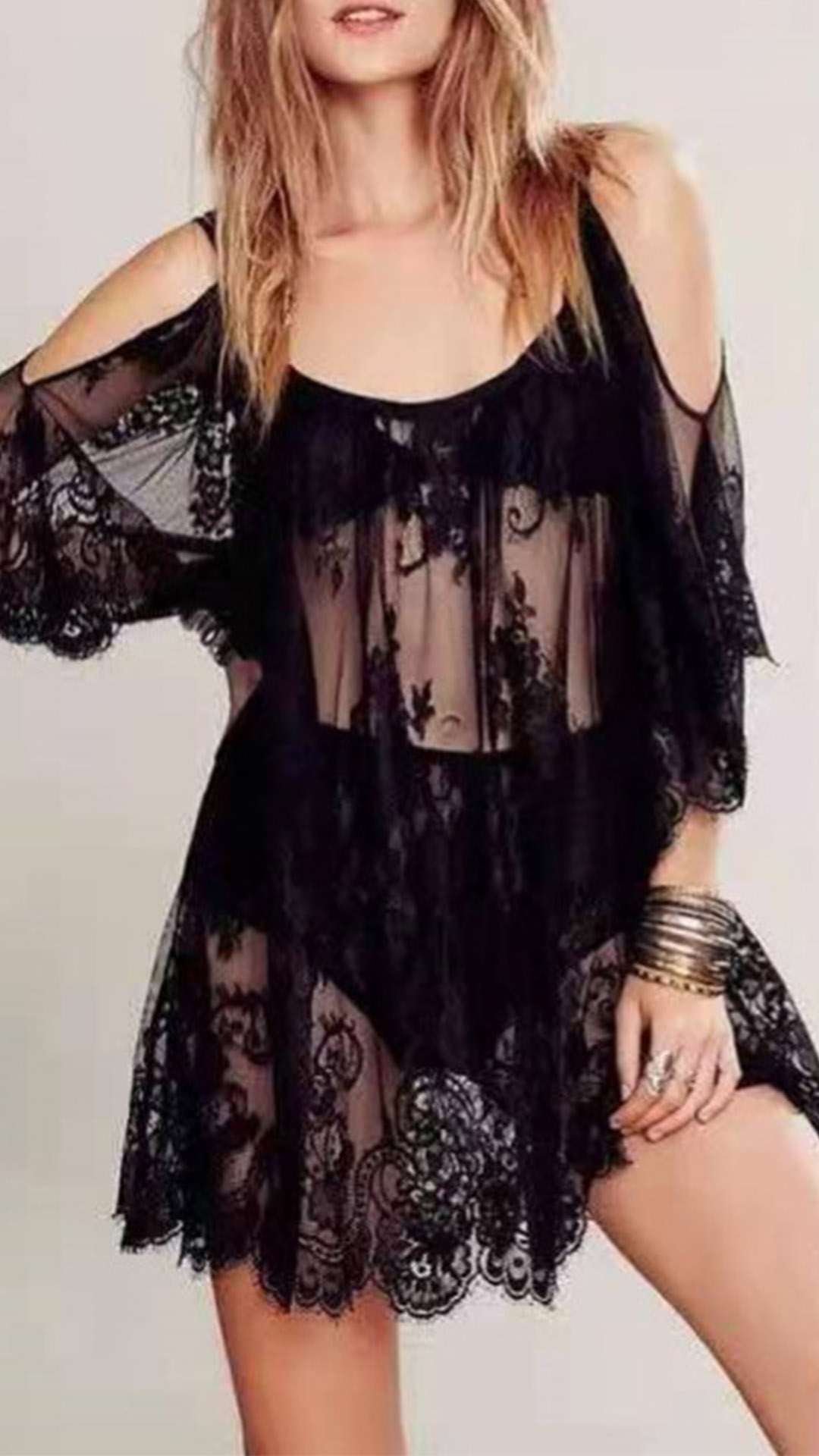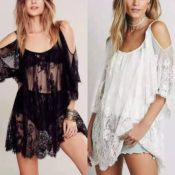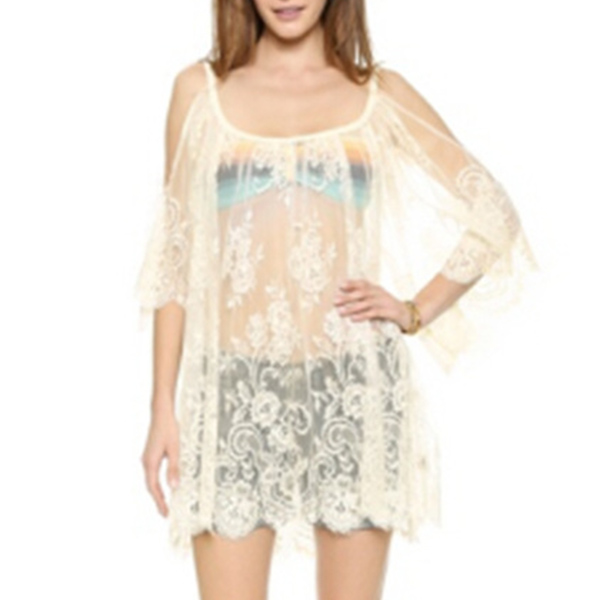 Wanna a sexy and alluring beach look? Then you can turn to this smock for help. See-through gauze details,off-shoulder and sling design make this piece look so flirty and sultry. Finished with 3/4 sleeve,round neck and a loose silhouette,this piece is perfect fit for matching with your sexy bikini set.