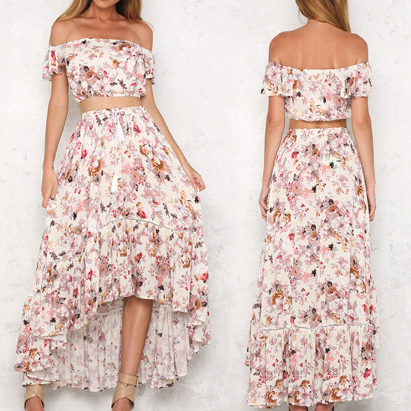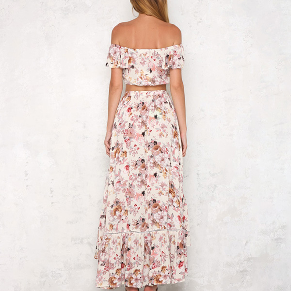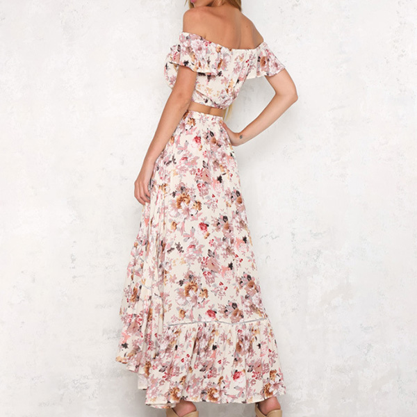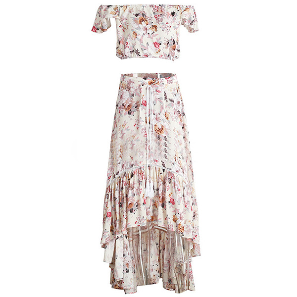 and vibrant floral print,including an off-shoulder wide neckline crop top and a high waist high-low hem skirt,