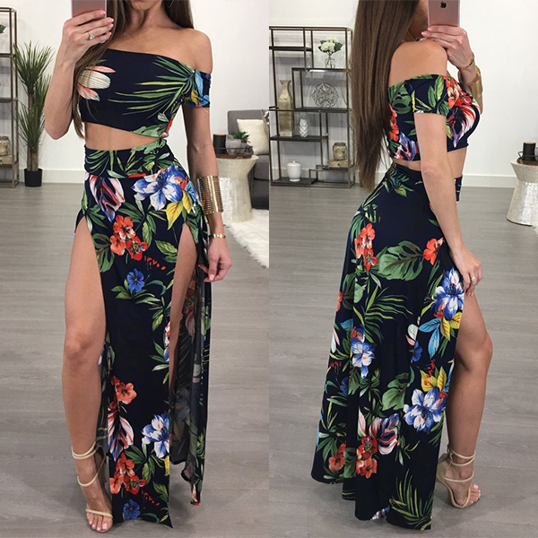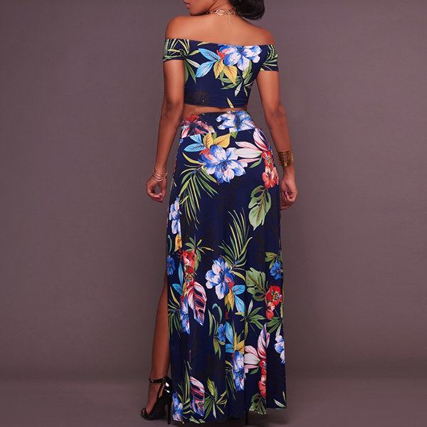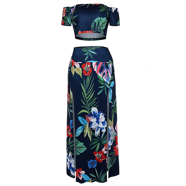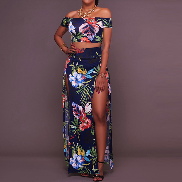 and eye-catching printed pattern,including an off-shoulder wide neckline crop top and a high waist slit hem skirt,