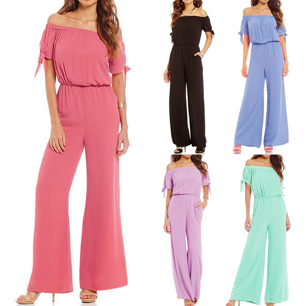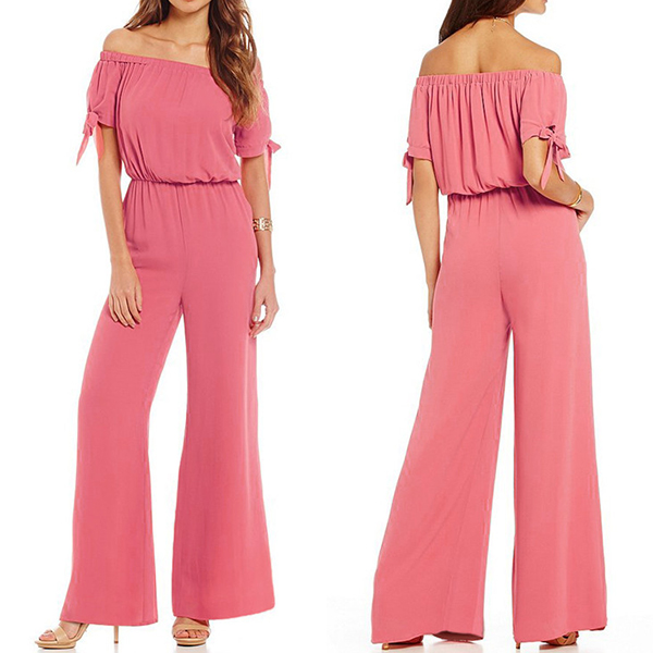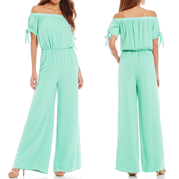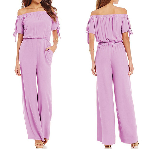 Solid color style,designed with an off-shoulder wide neckline,an elastic waist and a wide-leg silhouette,this jumpsuit knows