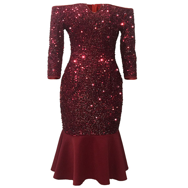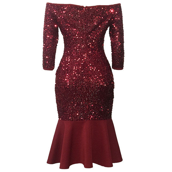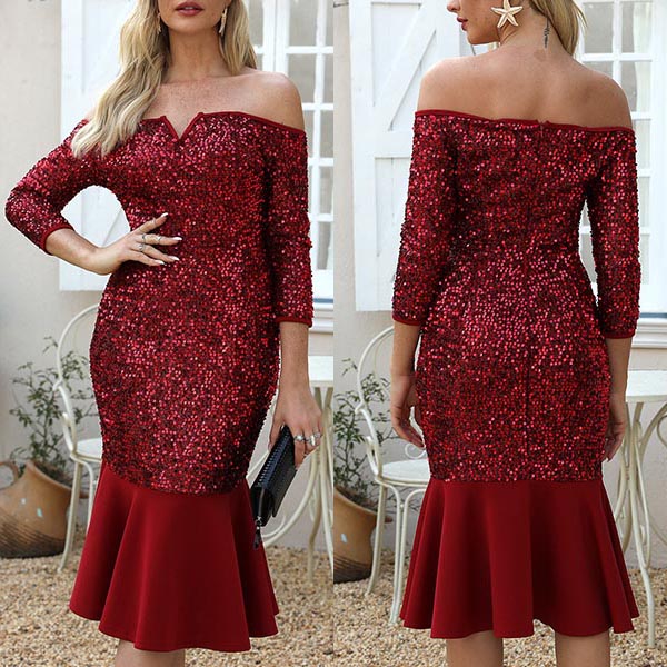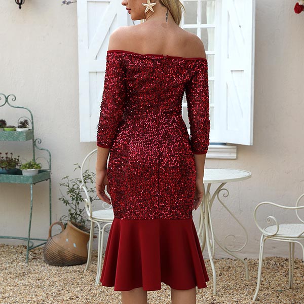 Sexy Off-shoulder Boat Neck Fishtail Hem Slim Fit Sequin Dress