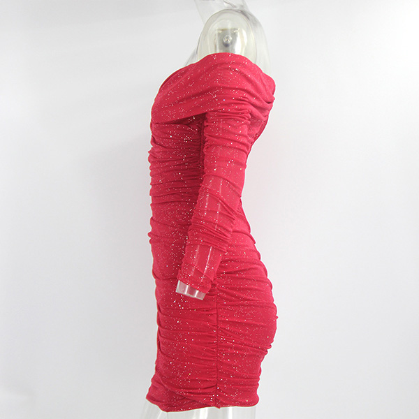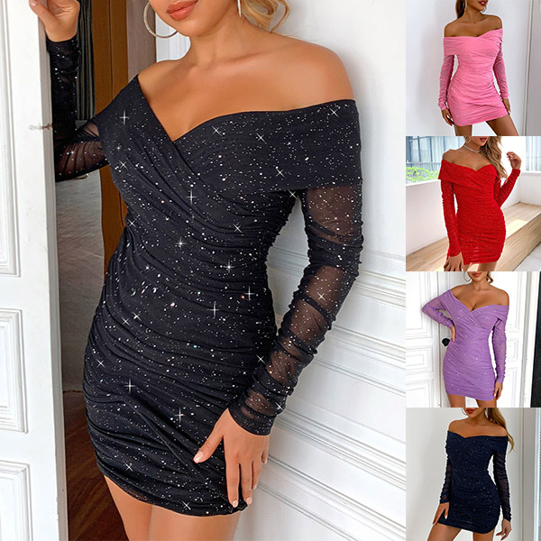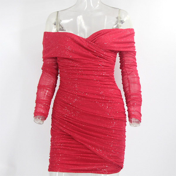 Sexy Off-shoulder Boat Neck Gauze Spliced Long Sleeve Slim Fit Glitter Party Dress