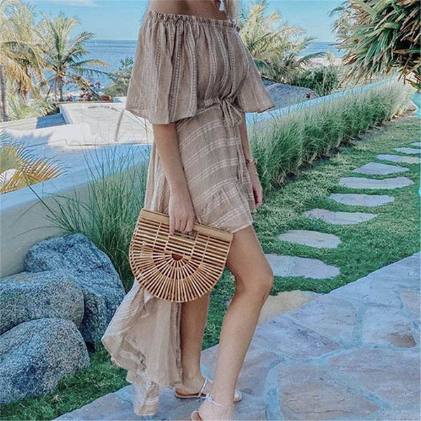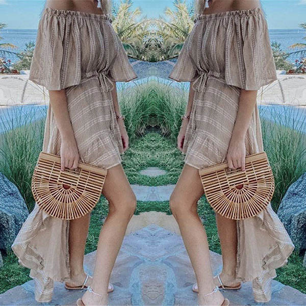 When strolling on the street with this dress,you can easily be a pleasant sight to draw more attention. Its alluring design details like off-shoulder boat neck and high-low hem design make this piece full of style and charm. For your weekend out and holiday trips,you can trust in this dress to make you look beautiful and charming!