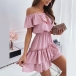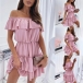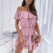 Sexy Off-shoulder Boat Neck High Waist Solid Color Ruffle Hem Dress