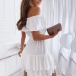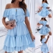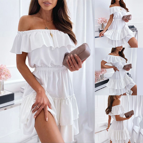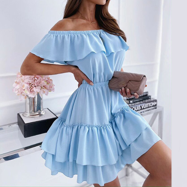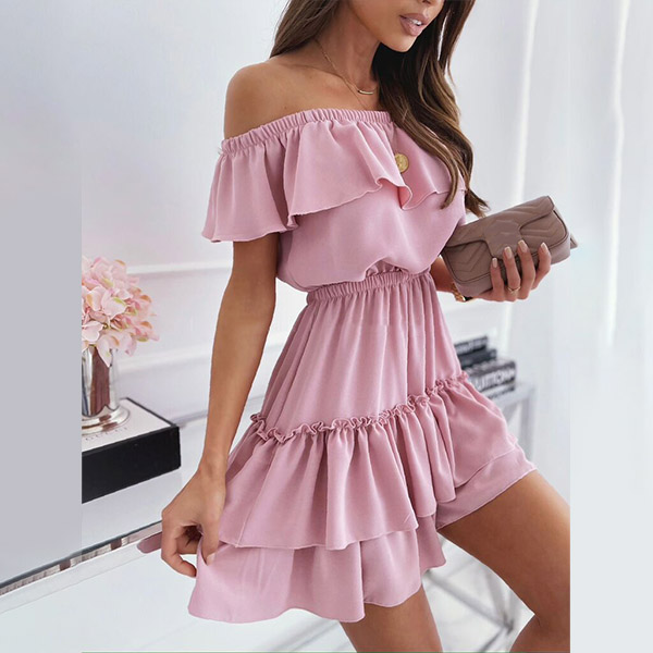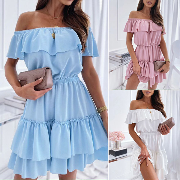 Inject a dash of sweet and flirty vibes to your wardrobe with this dress. It comes with a solid color,finished with ruffle hem and off-shoulder boat neck design,this dress can help you catch more eyes. If you add a choker necklace,you can look more beautiful and charming!
