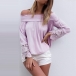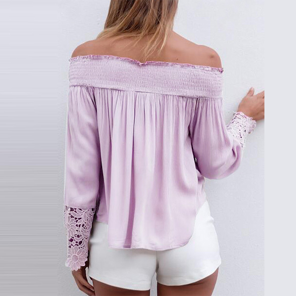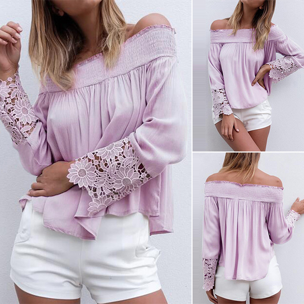 outfitted with an off-shoulder wide neckline,lace spliced long sleeve and a loose silhouette,this little item of course