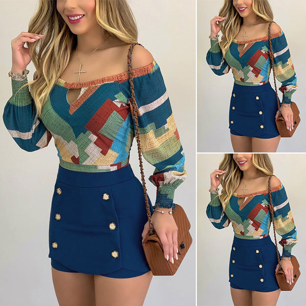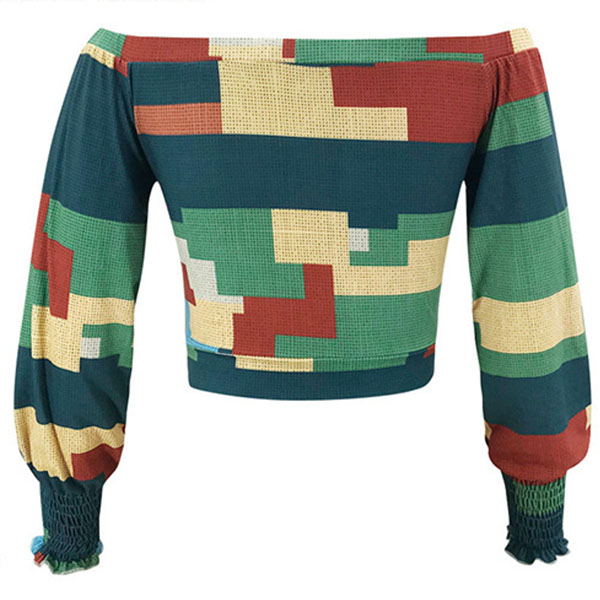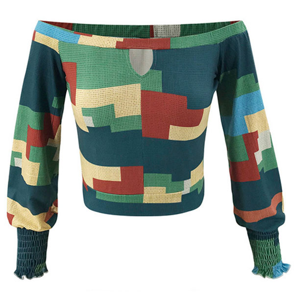 Sexy Off-shoulder Boat Neck Long Sleeve Contrast Color Printed Top