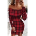 Sexy Off-shoulder Boat Neck Long Sleeve Slit Hem Slim Fit Plaid Dress