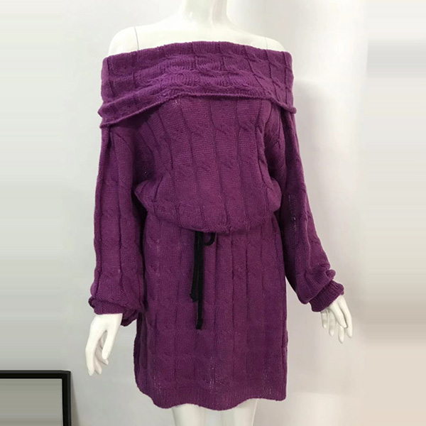 Sexy Off-shoulder Boat Neck Long Sleeve Solid Color Sweater Dress