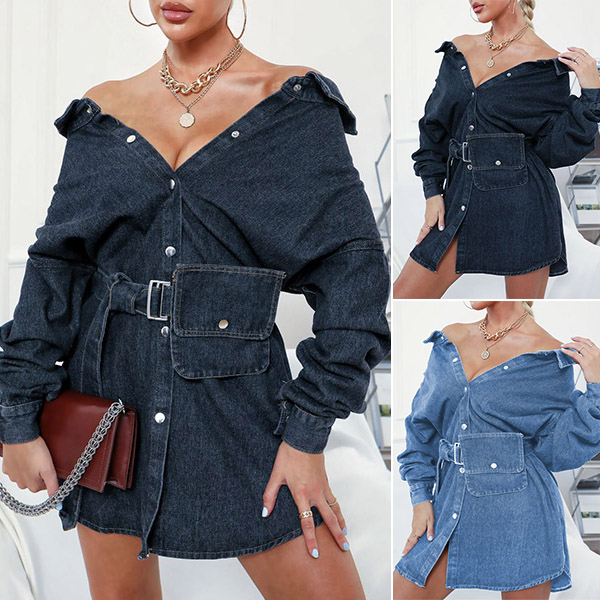 Sexy Off-shoulder Boat Neck Long Sleeve Tie-belt Denim Dress