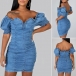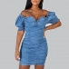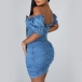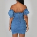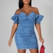 Sexy Off-shoulder Boat Neck Puff Sleeve Slim Fit Denim Dress