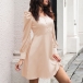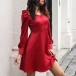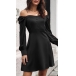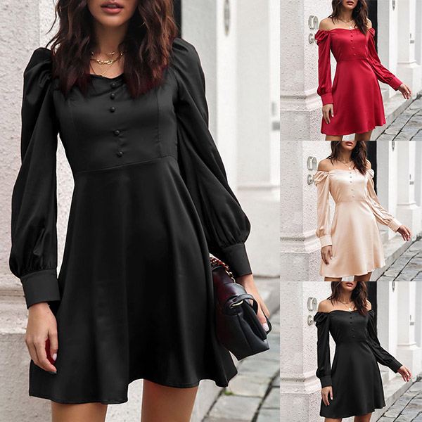 Sexy Off-shoulder Boat Neck Puff Sleeve Solid Color High Waist Dress